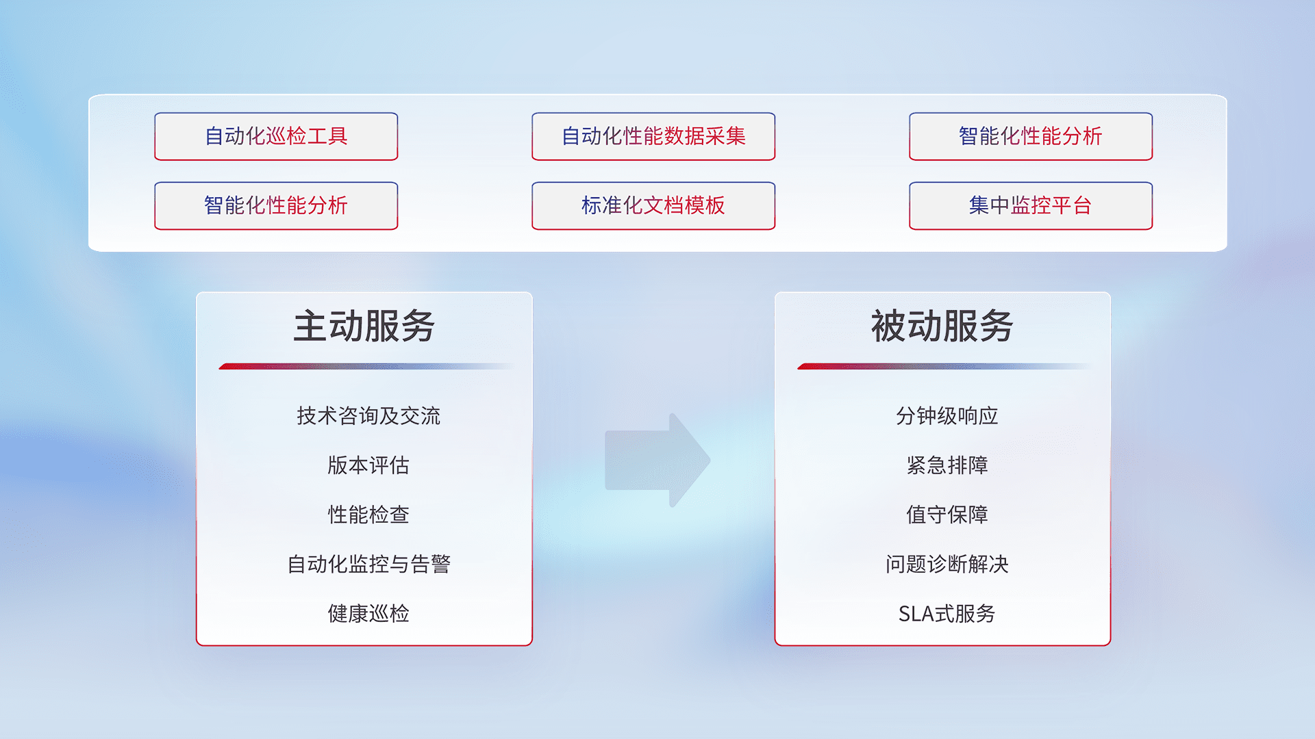 智能化工具和标准化文档,,,保障服务质量,,,,提供主动服务(包含技术咨询、、、版本评估、、性能检查、、、自动化监控与告警、、、、健康巡检)和被动服务包含(分钟级响应、、紧急排障、、值守保障、、问题诊断解决、、、、SLA服务)。。
